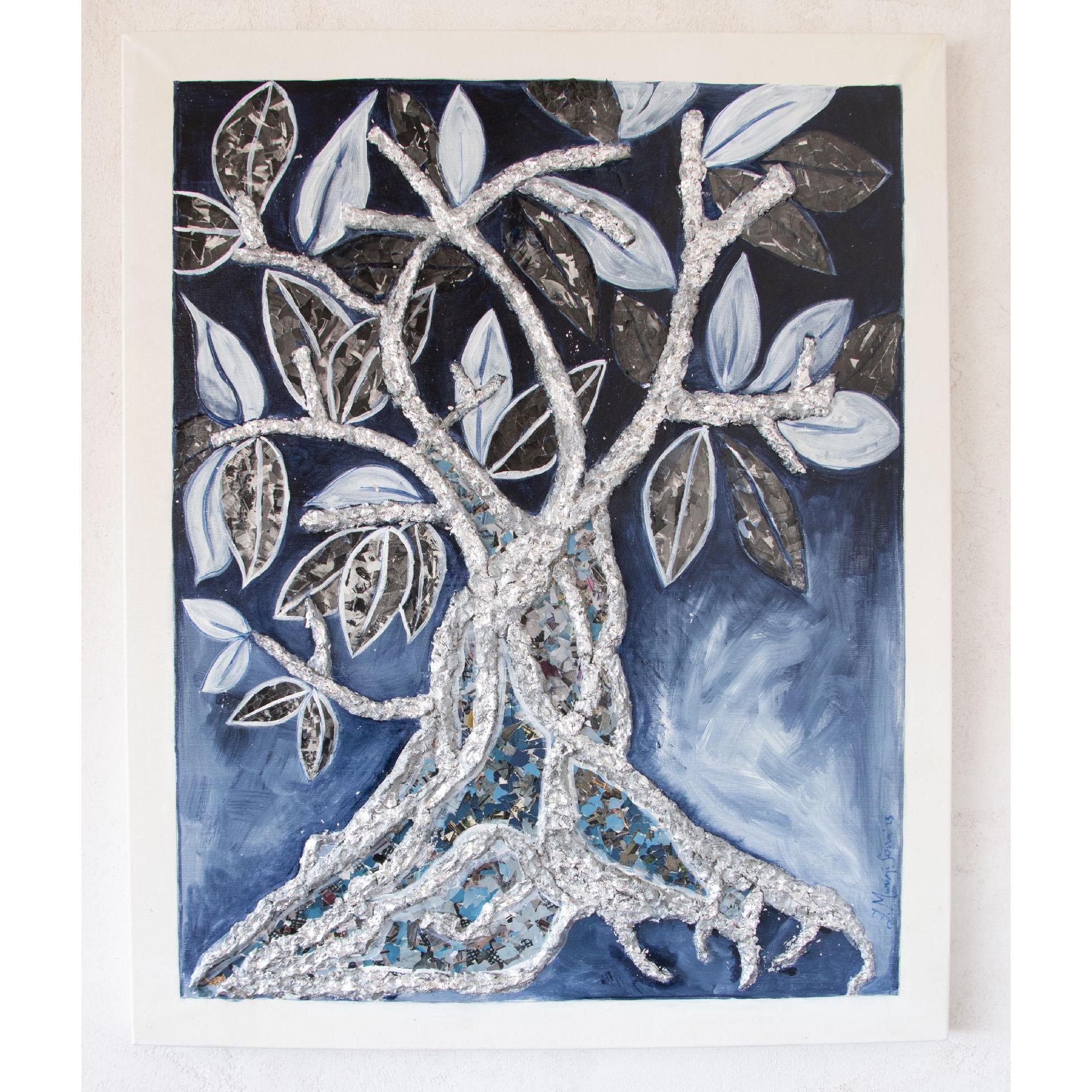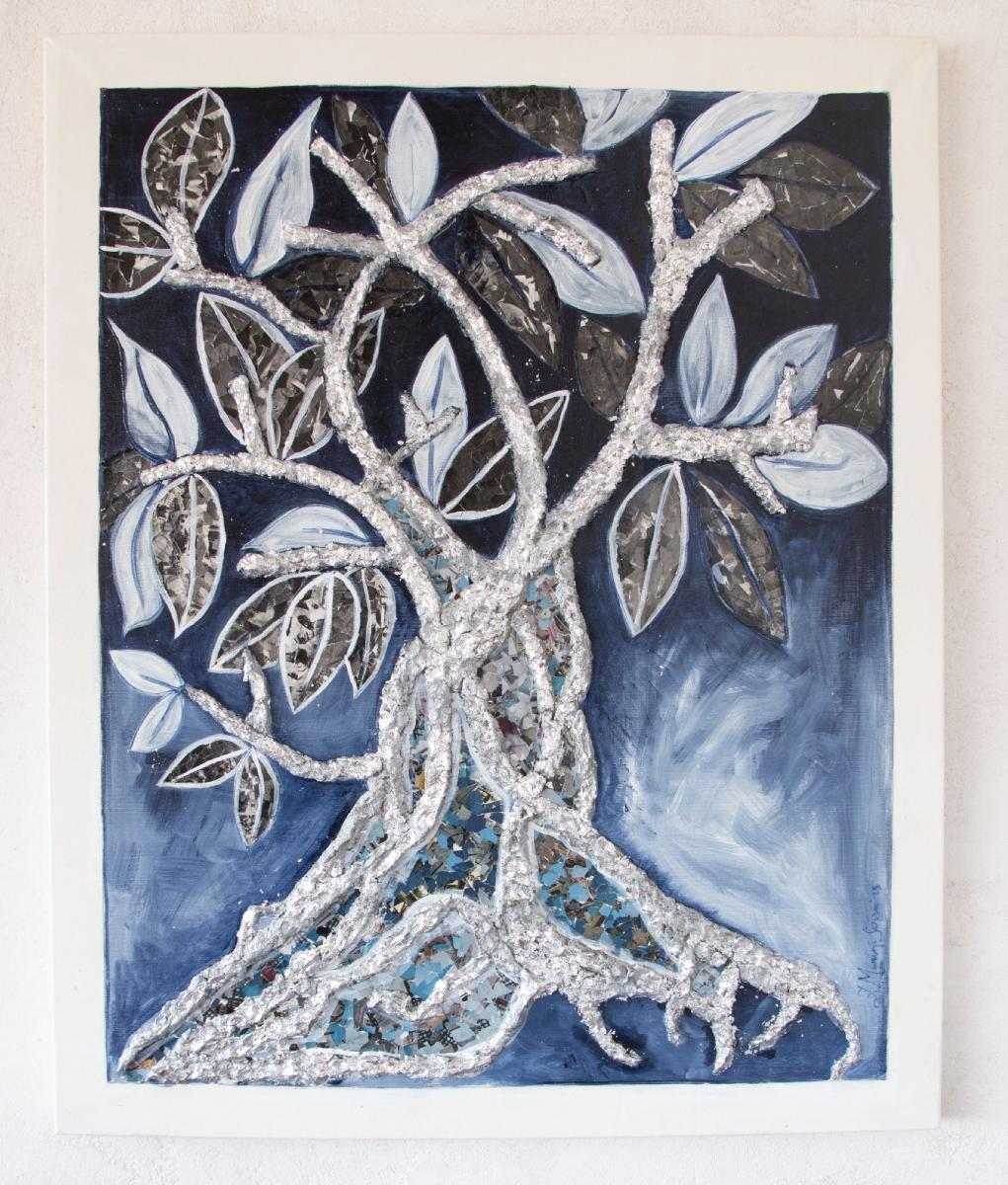 Opera realizzata con colore acrilico, collage e foglia argento. Raffigura un grande albero con foglie e radici arricchiti da frammenti colorati.