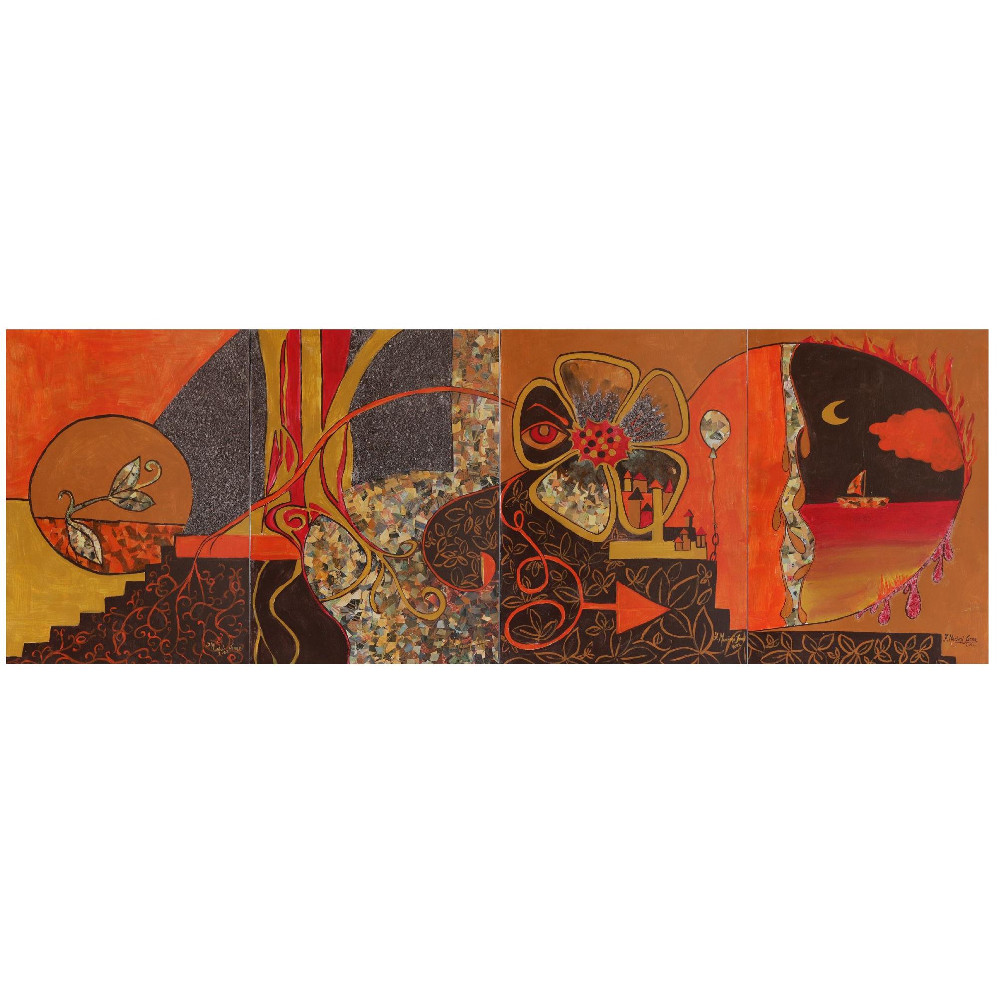 L’autunno nella sua calma apparente custodisce il rigenerarsi della vitae della natura. L’uomo trae linfa vitale dalle sue relazioni fondamentali(radici) che nell’autunno della vita si rivelano in modo sempre più chiaro esicuro, ma la sua stabilità è data anche dall’immergersi nelle vite altrui(collage), in un connubio e una contaminazione che apre la mente e il cuore anuove esperienze, nuovi tipi di cibo per l’anima e il corpo. Sa fiorire,portare frutto e lasciare il segno nella civiltà che vive (fiore con città ecollage) seppure spesso si lasci imprigionare da convenzioni e ritmi che losoffocano (palloncino legato) e torni a cercare respiro e lumi nella relazionecon la natura e col Creatore (freccia nelle foglie). Le sofferenze (fiamme) loaprono alla purificazione graduale dei rapporti affettivi e amicali (gocce disangue tra i collage) guidandolo a riconoscere il valore e il senso della vita(sale nelle gocce) e a ritrovare infine la quiete (notte e luna), seppure nellafrequente tentazione della nostalgia e del guardare indietro agli anni piùincoscienti della giovinezza (barca che va verso sinistra).