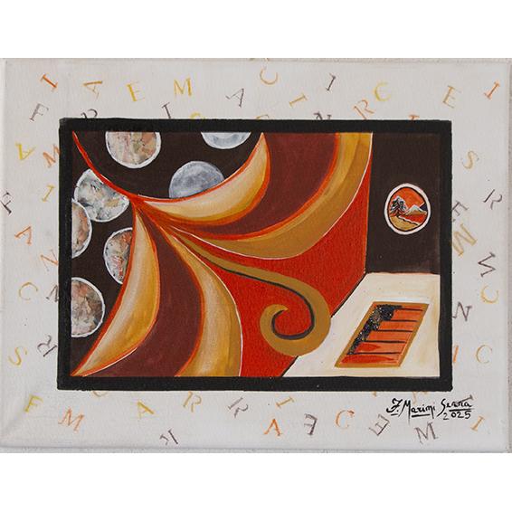 La rabbia rappresentata dal colore rosso qui prende l’aspetto dellaquiete apparente (quadro appreso con paesaggio) della rassegnazione che portaal rischio della disperazione, dell’implosione in sé stessi (scala verso ilbuio). Ma la Natura, vigile custode della vita, interviene impetuosa eimpertinente (fiore) facendosi portatrice di istanze e autoconservazione, vitae speranza (brodo primordiale, bolle). Le lettere sparse rappresentano leparole di consolazione che non vengono ascoltate nella sofferenza e le ragionidel dolore e della rabbia, che la pace della natura sa spezzare e convertire inforza creatrice.